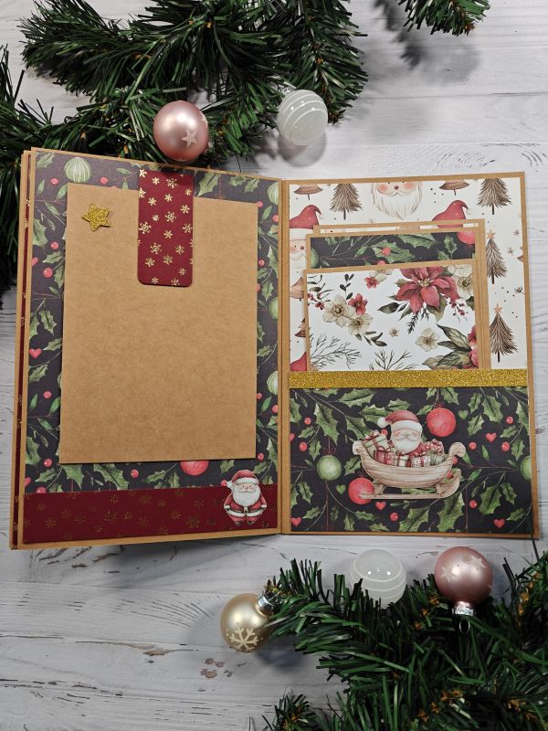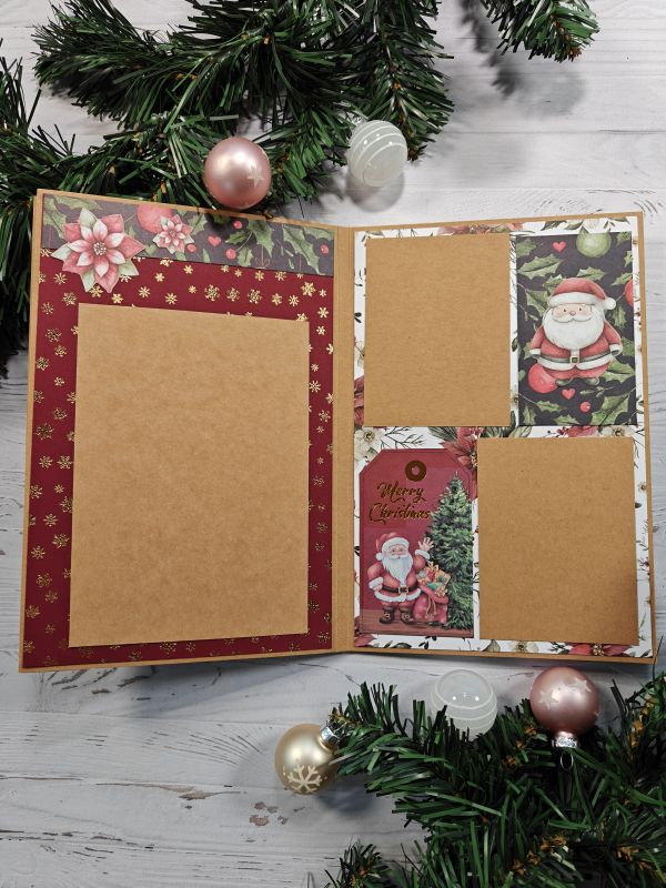 Les pages sont décorées de motifs variés : branches de houx, illustrations du Père Noël, flocons dorés, poinsettias et des aplats en couleur kraft sont placés par-dessus pour pouvoir y coller les photos.