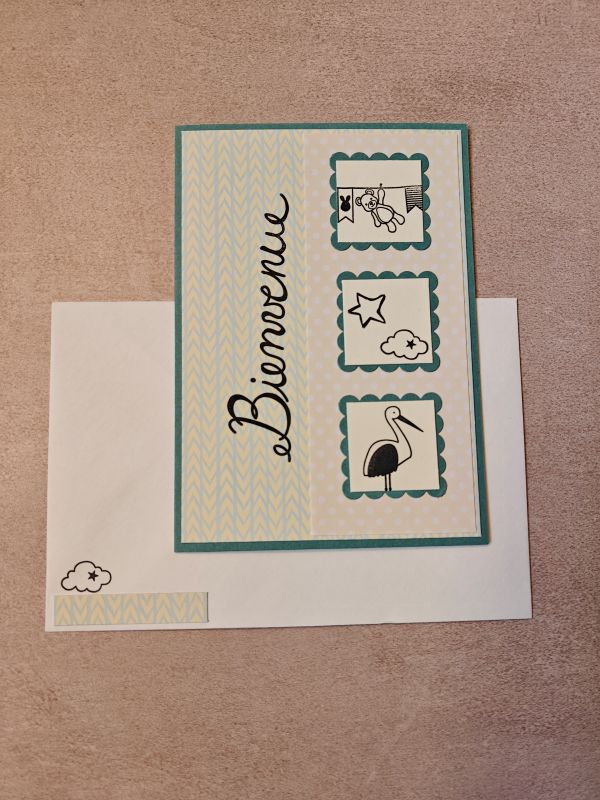 Une jolie carte dans les tons bleus pour souhaiter la bienvenue à un bébé.