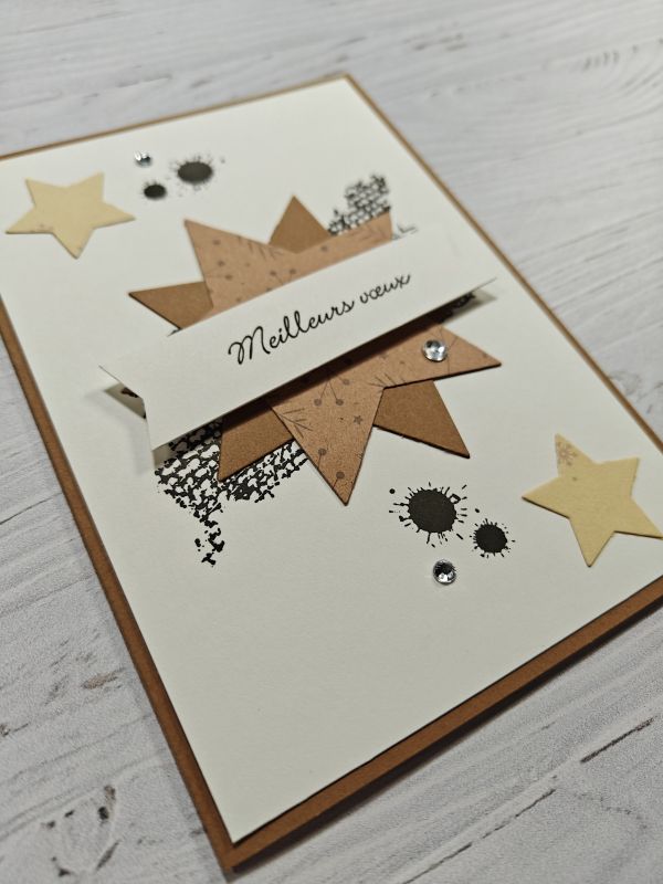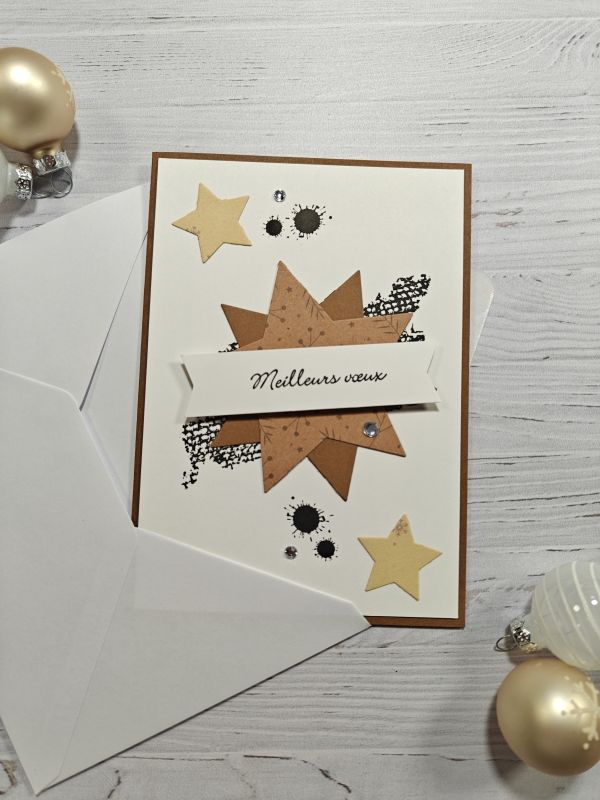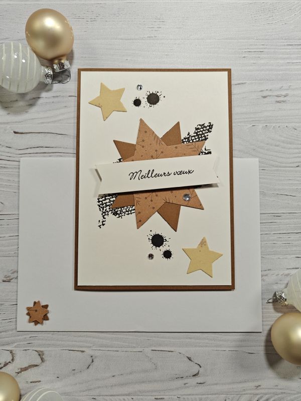 Carte de vœux sur fond couleur camel décorée d’étoiles assorties aux couleurs brunes et beiges et de petites taches tamponnées qui apportent une touche décalée.